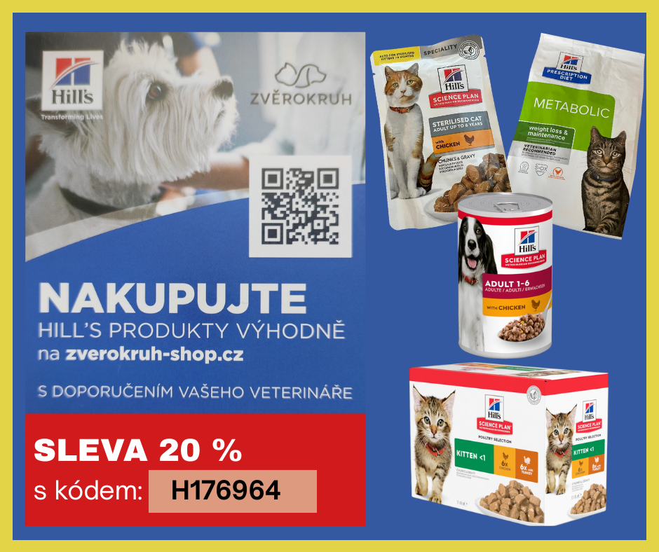 Díky mé spolupráci s firmou Samohýl group, která mi dodává potřebný materiál pro ošetření vašich mazlíčků, můžete využívat slevu 20 % při nákupu krmiva značky Hills jejich e-shopu www.zverokruh-shop.cz.